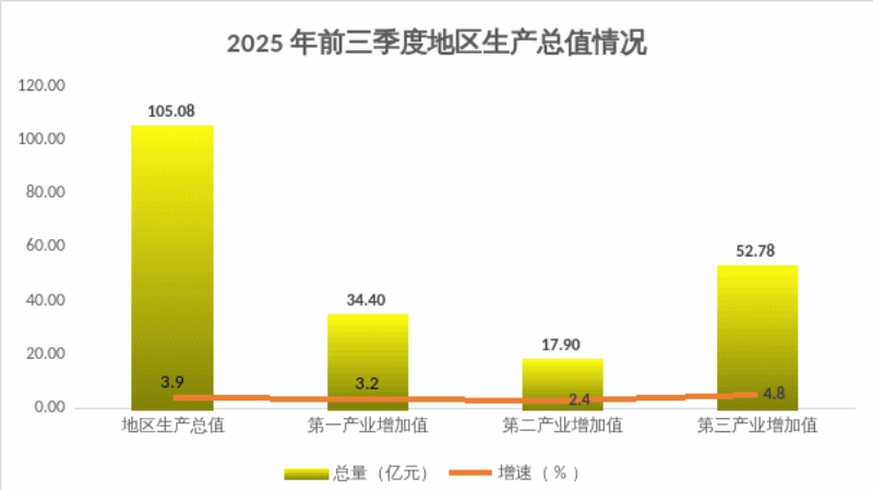 根據(jù)清遠市地區(qū)生產(chǎn)總值統(tǒng)一核算結果,2025年前三季度,陽山地區(qū)生產(chǎn)總值105.08億元,按不變價格計算,同比增長3.9%。其中,第一產(chǎn)業(yè)增加值34.4億元,增長3.2%;第二產(chǎn)業(yè)增加值17.9億元,增長2.4%;第三產(chǎn)業(yè)增加值52.78億元,增長4.8%,三大產(chǎn)業(yè)比例:32.7:17:50.2。