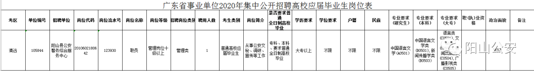 加入陽山警隊(duì)吧! 讓我們一起在陽山大地上 “乘風(fēng)破浪”吧 全省各級(jí)事業(yè)單位招聘工作人員20959名。報(bào)考人員可通過廣東省人力資源和社會(huì)保障廳網(wǎng)站(http://hrss.gd.gov.cn)、廣東組織工作網(wǎng)(https://www.gdzz.gov.cn)、廣東人事考試網(wǎng)(http://rsks.gd.gov.cn)查閱具體的招聘單位、崗位、人數(shù)和資格條件(詳見附件1)。 招聘對(duì)象為普通高等學(xué)校、技師學(xué)院2020年應(yīng)屆畢業(yè)生以及符合擇業(yè)期規(guī)定的高校畢業(yè)生。 港澳應(yīng)屆畢業(yè)生符合《粵港澳大灣區(qū)(內(nèi)地)事業(yè)單位公開招聘港澳居民管理辦法(試行)》和本公告規(guī)定的可報(bào)考相關(guān)崗位。 獲聘人員為事業(yè)單位編制人員,享受國家及省政策規(guī)定的薪酬待遇。 (一)報(bào)名時(shí)間 考生于2020年8月31日9:00至9月4日16:00登錄“廣東省事業(yè)單位公開招聘信息管理系統(tǒng)(考生報(bào)名)”(http://ggfw.gdhrss.gov.cn/sydwbk)報(bào)名。 (二)注意事項(xiàng) 1.考生只能選擇一個(gè)崗位報(bào)名。報(bào)名時(shí)應(yīng)確保所填各項(xiàng)信息真實(shí)有效,凡以虛假信息報(bào)名的,一經(jīng)查實(shí)即取消考試及聘用資格??忌鷳?yīng)踐行誠信報(bào)考,對(duì)惡意報(bào)名、攻擊報(bào)名系統(tǒng)的人員,將按照有關(guān)規(guī)定處理。涉嫌犯罪的,移送司法機(jī)關(guān)處理。 2.考生應(yīng)于面試資格審核前取得相應(yīng)畢業(yè)證書、學(xué)位證書及崗位要求的其他證明材料。 3.經(jīng)省人力資源社會(huì)保障廳統(tǒng)一招募的服務(wù)期滿考核合格的廣東省“三支一扶”高校畢業(yè)生及具有本科學(xué)歷、學(xué)士學(xué)位的退役大學(xué)生士兵參加考試的,不受崗位戶籍條件限制。 (三)打印準(zhǔn)考證 報(bào)名成功考生請(qǐng)于2020年9月28日9:00至30日17:00登錄“廣東省事業(yè)單位公開招聘信息管理系統(tǒng)(考生報(bào)名)”,自行下載打印準(zhǔn)考證。準(zhǔn)考證是參加本次公開招聘的重要證件,請(qǐng)考生妥善保管。