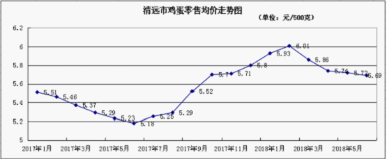 自2017年底起,我市雞蛋價格觸底反彈,養(yǎng)殖戶維持良好的蛋雞補欄意愿,2018年上半年雞蛋價格保持高位運行,每500克平均零售價為5.83元,環(huán)比升5.23%,同比升9.18%。